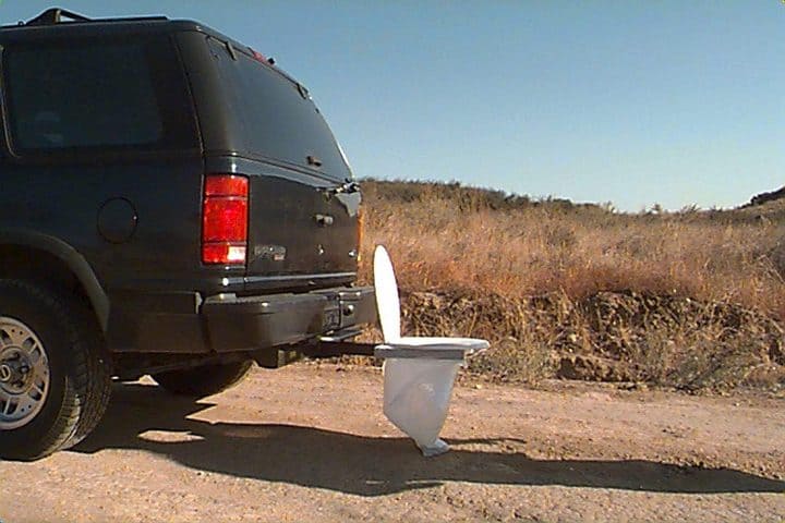 Be ready when nature calls with the bumper dumper portable toilet. This innovative toilet makes it easy to answer nature’s call when you are on the road or on the go. Its a hitch mountable toilet seat that attached to your vehicle tires or towing hitch to provide a sturdy solid surface to sit and take a dump. Unlike cheap imitations, the steel powder coated frame can hold up to 500 lbs and comes with a standard toilet seat. When nature calls just slide it into the 2×2 hitch receiver and you’re ready to go. You can cover the frame with a kitchen trash liner bag or you can attach a 5-gallon bucket available at most hardware stores to collect your hardware. The portable toilet can also be used as a stand alone unit if mounted on a 5-gallon bucket.
